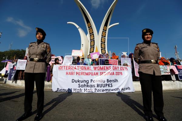 Two female police officers stand guard over International Women’s Day 2019 in Aceh / Simanjuntak. Efe.com
